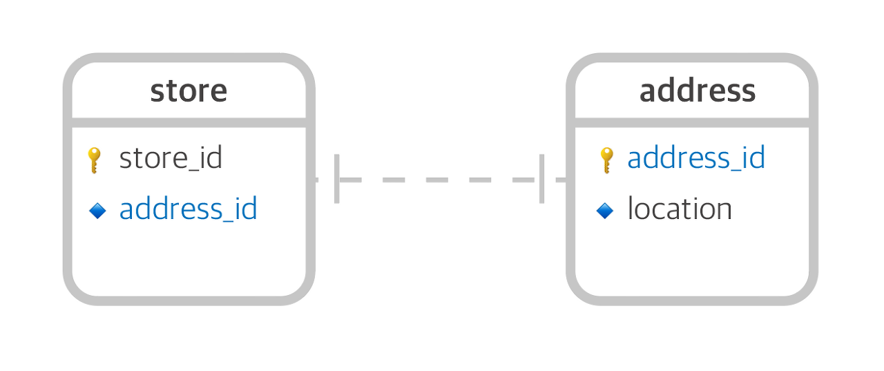 : 양쪽 모두 단 하나씩 존재하는 경우이다. 예를 들면, 어떤 상점에는 하나의 주소만이 존재한다.