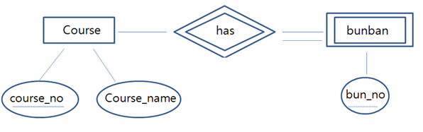 - 1203 이라는 강의가 존재하고, 001, 002, 003..분반이 있다고 했을때, 이 분반 이름은 따로 특징이 없고 다른 강의와도 겹칠 수 있다. 이를 단독으로 존재할 수 없고, 다른 개체에 의존해야 하는 Weak Entity라고 한다.