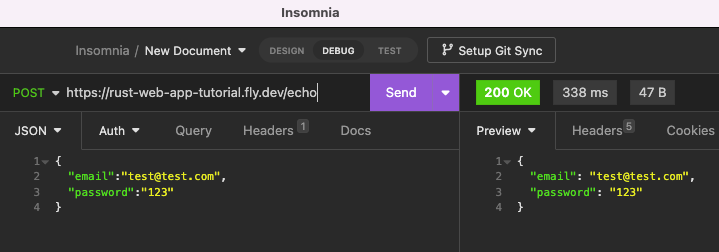 ➜ rust-fly-test git:(master) ✗ curl http://127.0.0.1:8080/echo -X POST -d "{"id":"1", "name":"cpro95"}"