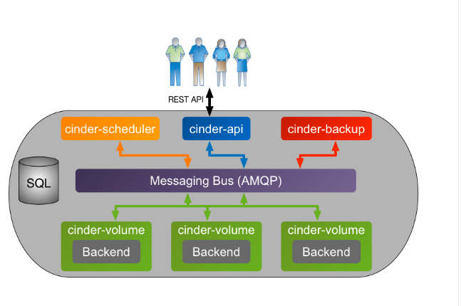 오픈스택에서는 Cinder라는 이름의 블록 스토리지 컴포넌트가 존재한다. Cinder는 아래와 같이 cinder-volume, cinder-scheduler, cinder-api, cinder-backup으로 구성되며 구체적인 역할은 다음과 같다.
