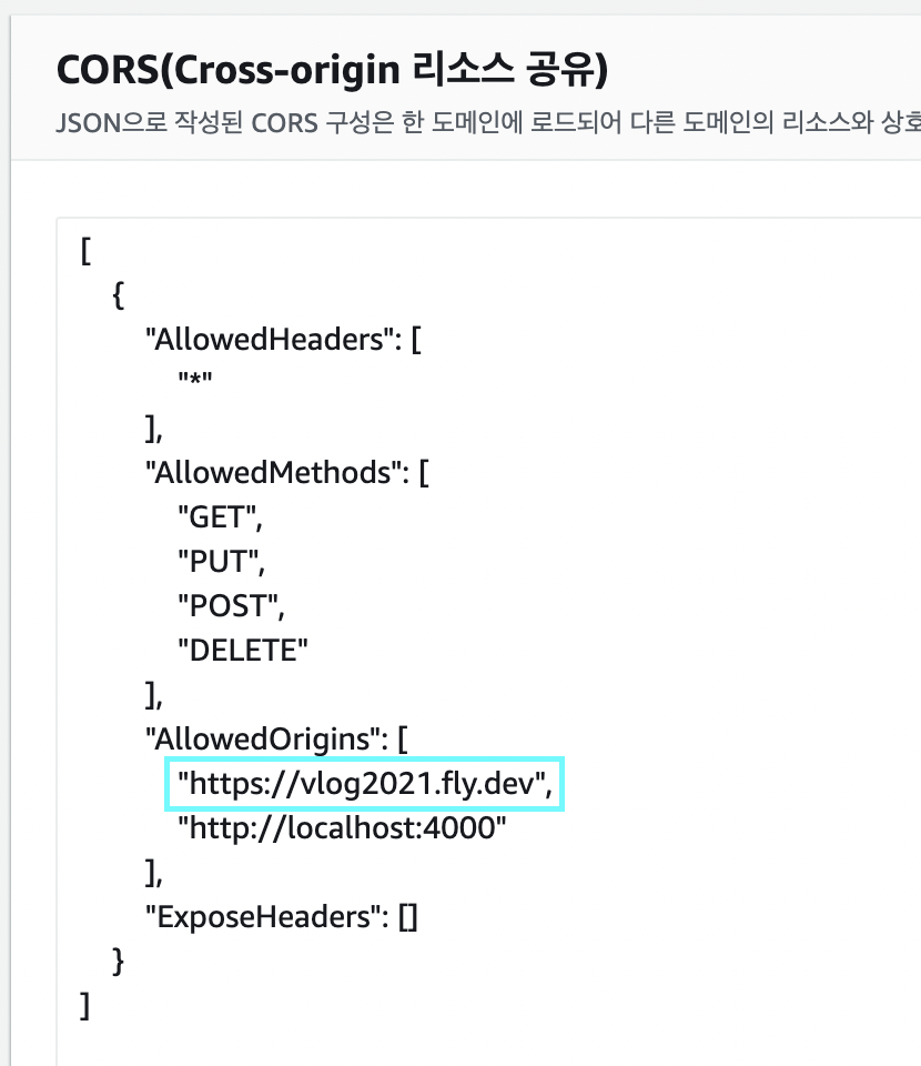 AWS S3 버킷을 사용 중이기 때문에 버킷 권한에서 아래와 같이 CORS 설정을 하면 된다.