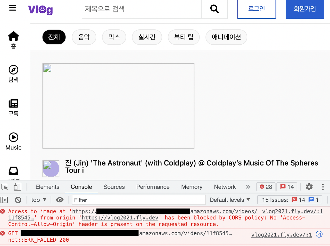 콘솔을 열어보니 cors 문제가 가득가득 빨간색으로 표시되어 있었다.