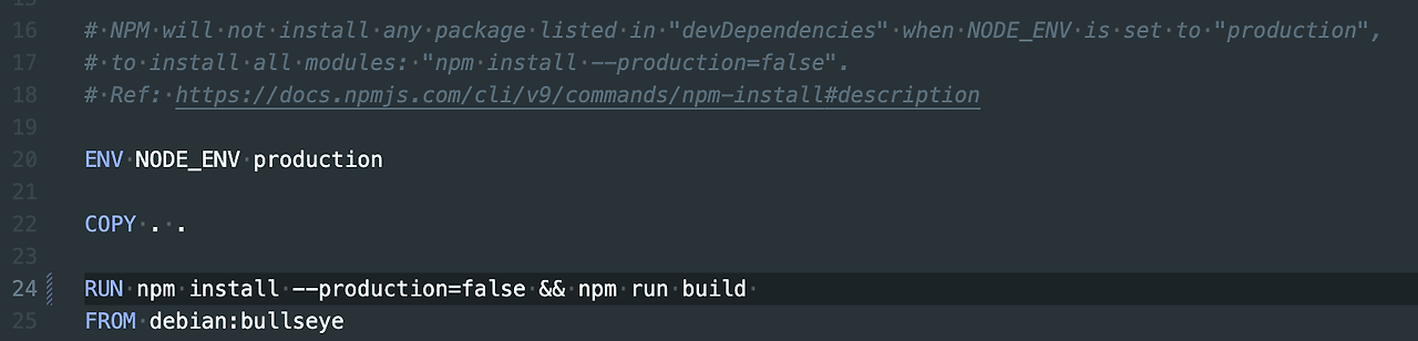 따라서 npm install --production=false을 추가하여 아래와 같이 명령어를 바꾸고 Dockerfile을 저장하자.