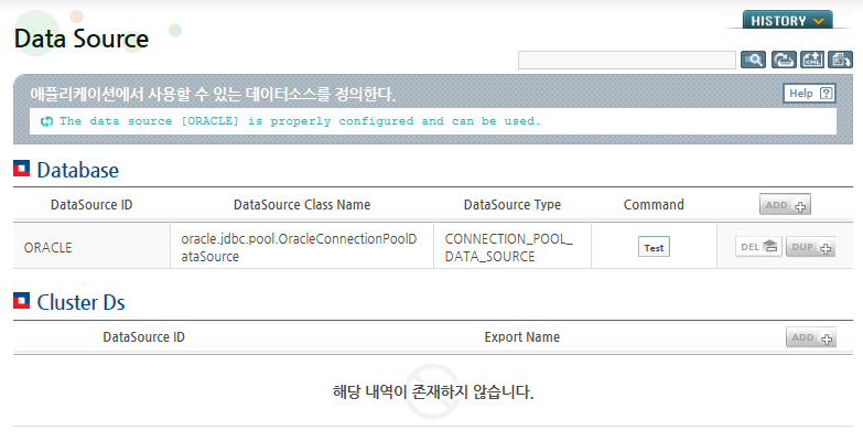datasource를 이용해서 연결하기 위해 ojdbc8.jar를 $JEUS_HOME/lib/datasource 폴더에 넣어준다. 그리고 webadmin에 접속해서 datasource를 생성한다.