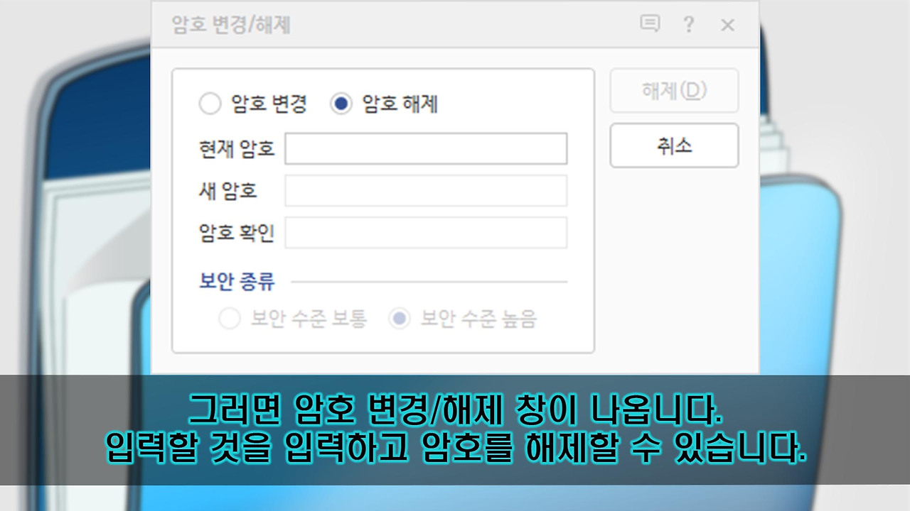 아무튼, 그렇게 클릭을 하면 '암호 변경/해제' 창이 나옵니다. 여기서 입력할 것들을 입력하고 우측 상단의 '해제(D)' 버튼을 클릭하면 됩니다.