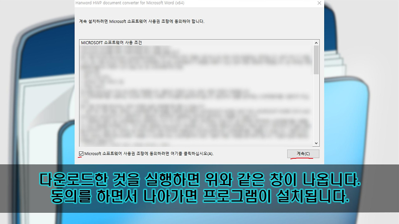 그렇게 해서 다운로드받은 것을 실행하면, 위의 사진처럼 나옵니다. 내용을 읽고 동의하라는 내용입니다. 이걸 동의를 해야 프로그램을 설치할 수 있습니다.