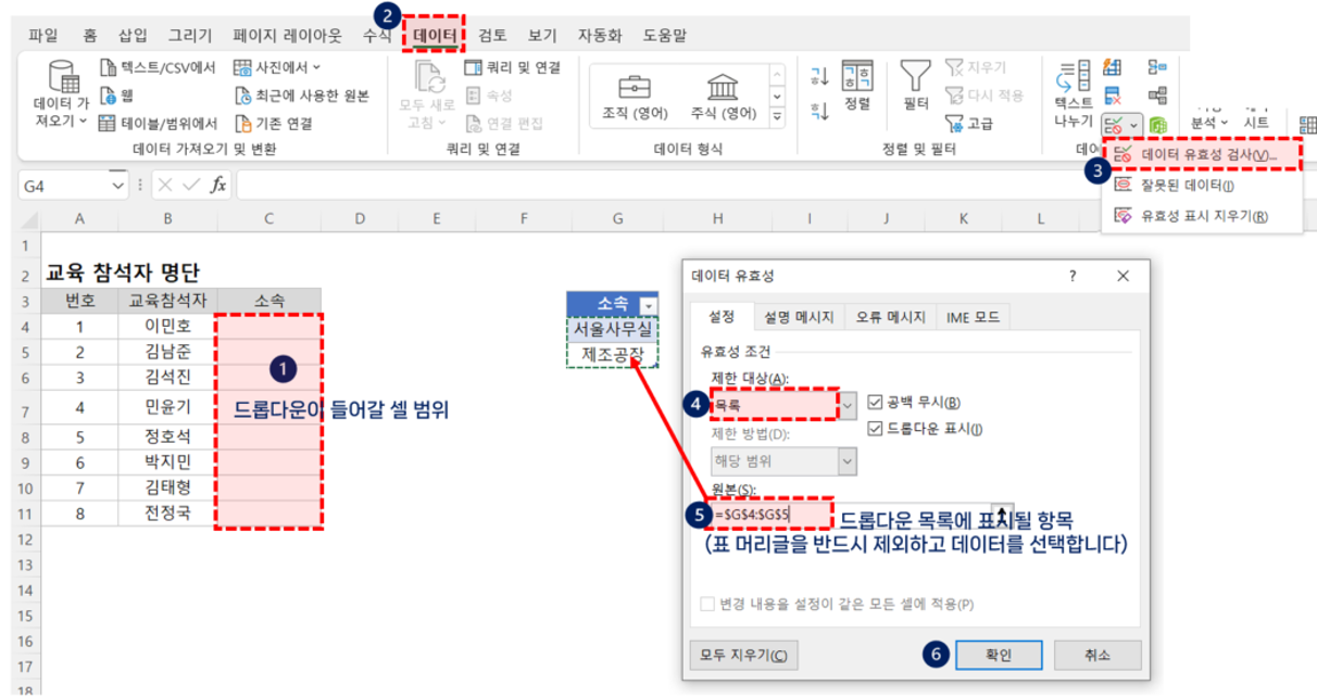 ①드롭다운이 들어갈 셀범위(C4:C11)를 선택한 후, ② [데이터] 탭 클릭 - ③ [데이터 도구] 그룹에서[데이터 유효성 검사]를 클릭합니다. 데이터 유효성 검사 대화상자가 실행되면, [설정] 탭을 클릭 후 ④제한대상에서 '목록'을 선택- ⑤ 원본의 범위로 머리글을 제외한값이 입력된 범위(G4:G5) 선택- ⑥ [확인]을 클릭합니다.