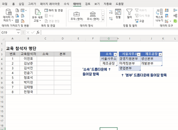 교육참석자 명단 작성 예시를 통해 참석자의 '소속'을 목록에서 선택할 수 있는 드롭다운 목록상자를 만들어보겠습니다.