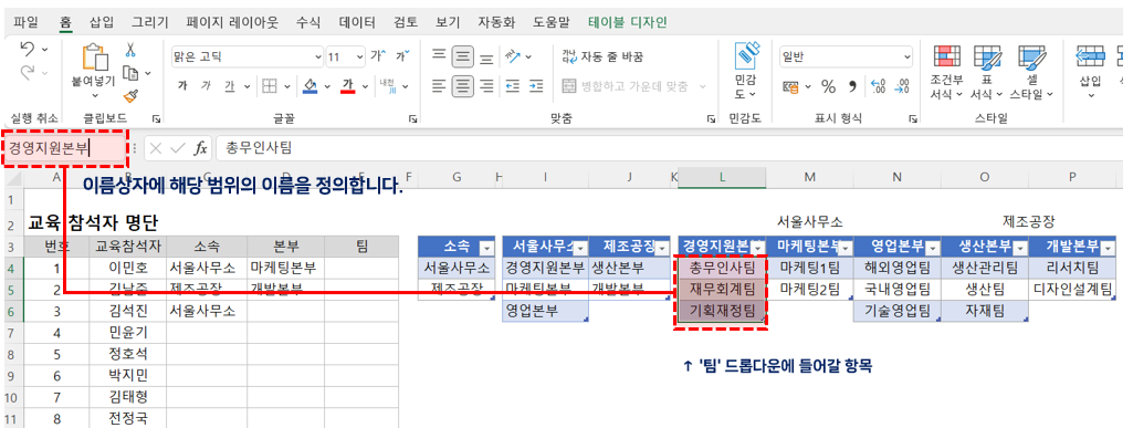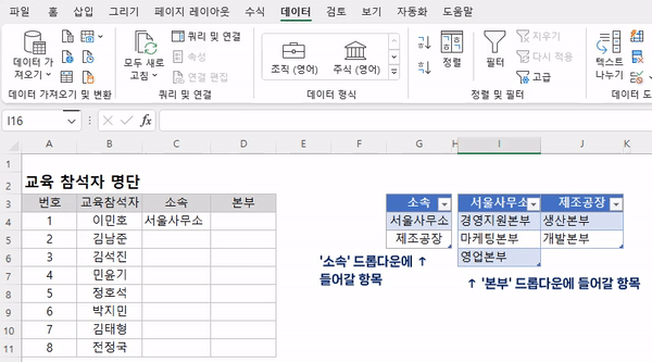 이번에는 C열에 작성한 '소속'(대분류) 에 따라, D열의 '본부'(중분류)를 목록에서 선택하는 드롭다운 이중 유효성 검사 목록상자를 만들어 보겠습니다.