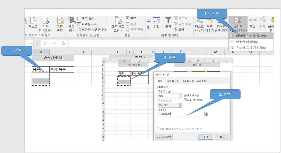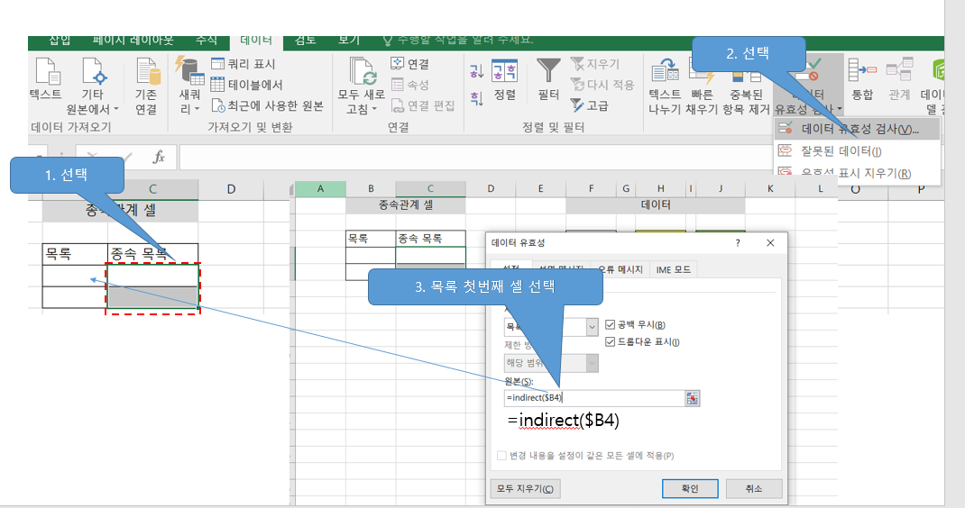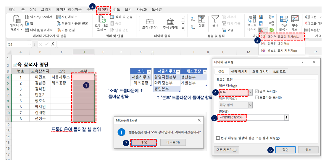 ① D열에 드롭다운이 들어갈 셀범위(D4:D11)를 선택한 후, ②[데이터]탭 클릭 - ③ [데이터 도구] 그룹의 [데이터 유효성 검사]를 클릭합니다. [데이터 유효성 검사] 대화상자가 실행되면 [설정] 탭 - ④ [제한대상]에서'목록'을 선택 - ⑤ [원본]범위를"=INDIRECT($C4)"로 입력하고 - ⑥ [확인] 클릭 - ⑦'원본은(는) 현재 오류상태 입니다. 계속하시겠습니까?'라는 대화상자가 나오면[예]를 클릭합니다.