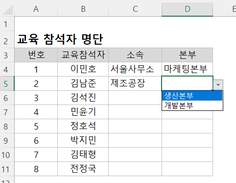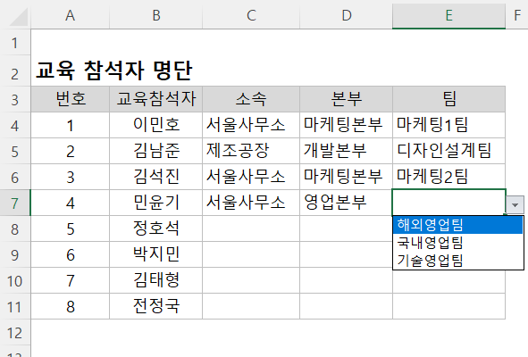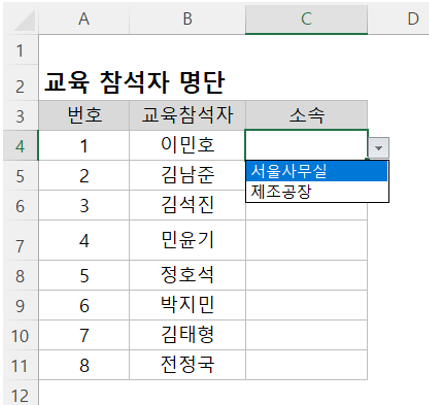 목록상자를 적용하기 위해 선택했던C4:C11 범위 드롭다운 목록이 적용되었습니다. 이제 교육참석자의 소속을 드롭다운 목록에서 선택하여 입력할 수 있습니다.