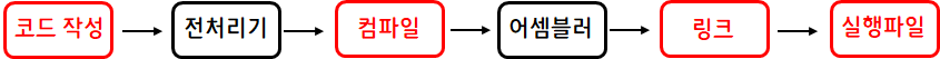 실행파일은 코드 작성, 전처리기, 컴파일, 어셈블러, 링크 과정을 거쳐서 만들어지게 됩니다.