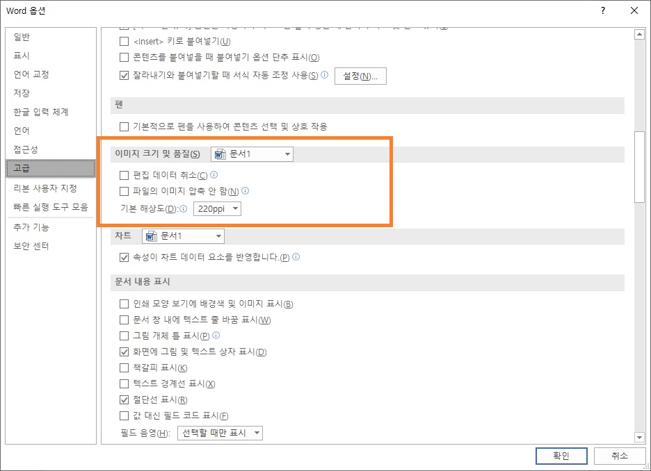 워드의 옵션에서 "고급-이미지 크기 및 품질" 항목을 확인합니다.