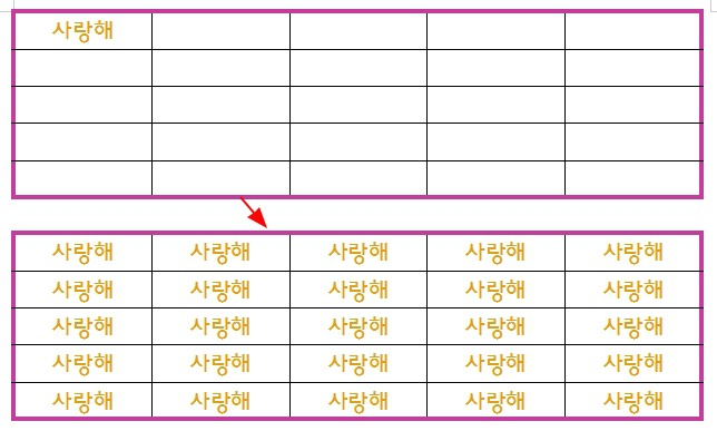아래에서 일반적으로 사랑해라는 단어를 복사(CTRL+ C)를 해서 전체 표의 범위를 선택해서 붙여넣기(CTRL+V)를 하면 복가가 됩니다. 가장 많이 사용하는 방법입니다. 이외에 한글에서 표에 동일한 글자를 삽입할 때 더 편리하고 간단하게 할 수 있는 방법이 있습니다. 바로 단축키 A(ALL)를 이용하는 방법입니다.