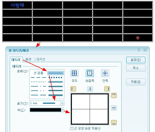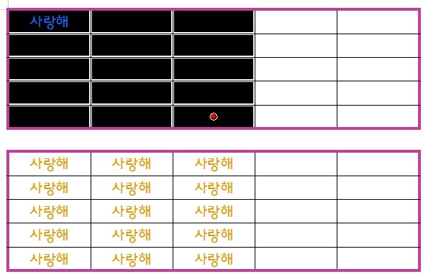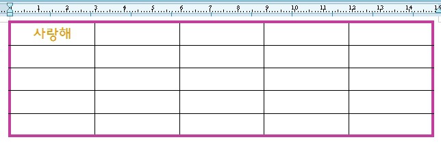 아래와 같이 테두리만 굵게 설정이 되었습니다. 그리고 첫행, 첫열에 사랑해라는 단어가 삽입이 되어 있습니다. 이 사랑해라는 단어를 단축키를 사용해서 채워보도록 하겠습니다.