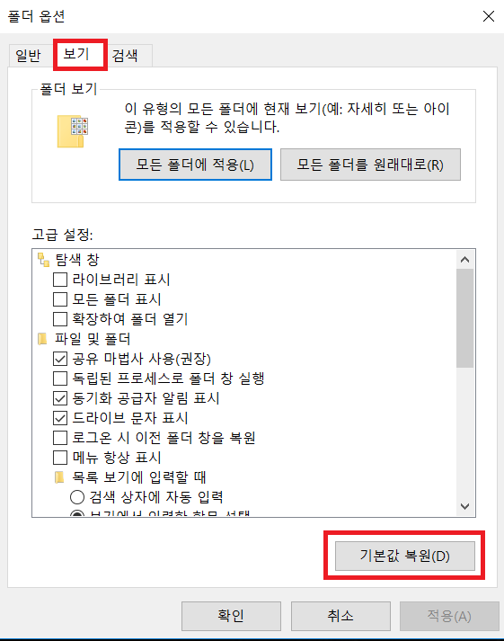 - 탐색기를 연 후 상단의 보기 > 옵션을 클릭, 나타나는 폴더 옵션 창에서 보기 탭을 클릭 후 아래 보이는 기본값 복원 > 확인을 클릭하여 기본값을 복원을 시도합니다.
