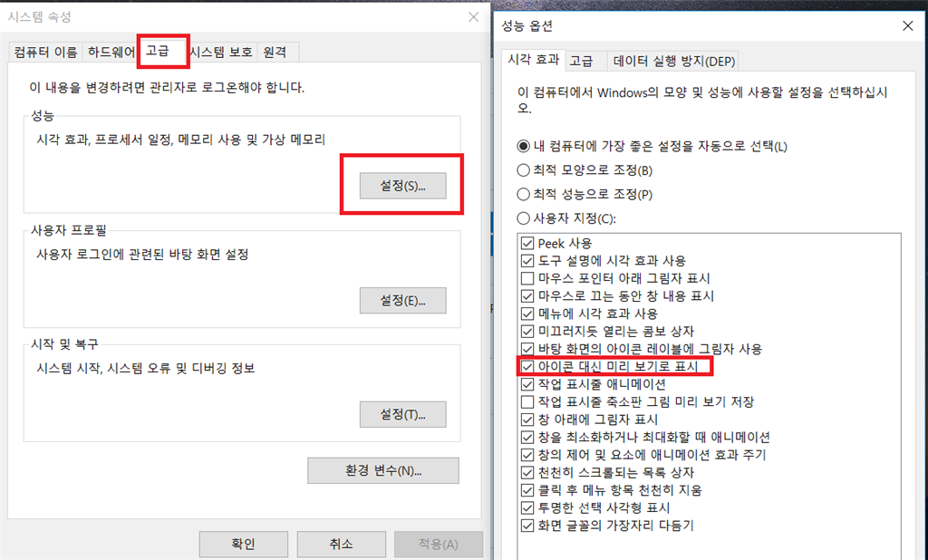 - 고급 탭의 성능에서 설정을 클릭하여 나타나는 성능 옵션에서 아이콘 대신 미리 보기로 표시에 체크한 후 확인을 클릭합니다.