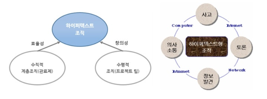 - 고도의 기술과 지식을 가진 사람이 본래의 소속 부서에 있으면서 자유자재로 모여 융합하고 그 결과 새로운 지식을 창조하는 조직이 바로 하이퍼텍스트 조직