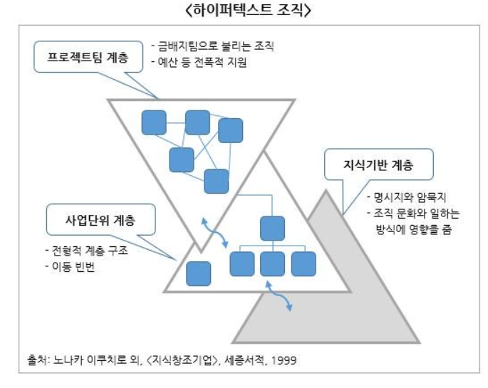 특히 저자들은 지식창조와 지식경영에 적합한 새로운 조직구조인 '하이퍼텍스트 조직'(Hypertext Organization)을 제시함.
