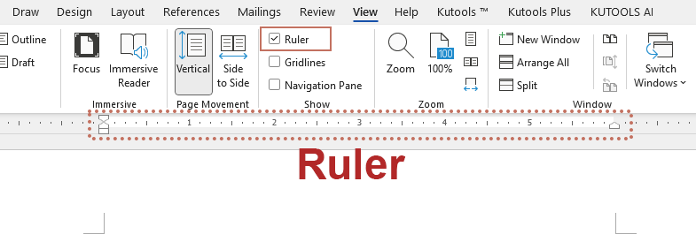 - 들여쓰기 표시를 사용하기 전에 눈금자가 보이는지 확인해야 합니다. 다음을 클릭하세요. 관측 탭을 클릭 한 다음 지배자 상자. 그러면 문서의 상단과 왼쪽에 눈금자가 표시됩니다. 스크린샷 보기:
