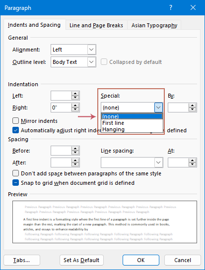 - . 절 대화 상자에서 들여 쓰기 및 간격 탭. 아래에 들여 쓰기, 이달의 스페셜 드롭 다운 메뉴 및 선택 없음 선택권. 스크린 샷보기 :