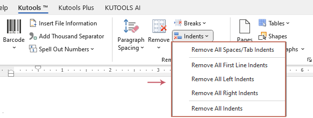 하지만 그게 전부는 아닙니다! Word용 Kutools는 모든 문서 형식 요구 사항을 충족하기 위해 다양한 들여쓰기 제거 기능을 제공합니다. 단락 들여쓰기, 내어쓰기, 기타 유형의 들여쓰기 등 몇 가지 간단한 단계만으로 모든 작업을 처리할 수 있습니다.