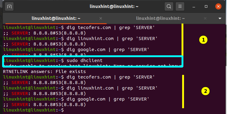 Now, if you run the dhclient command (maybe more than once) or reboot, the resolv.conf will reset and the DNS server will be set to old value. Verify with the ‘dig’ command: