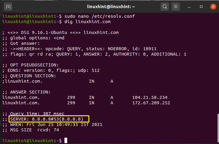 To check these settings, use the dig command. It will show you the DNS server IP address: