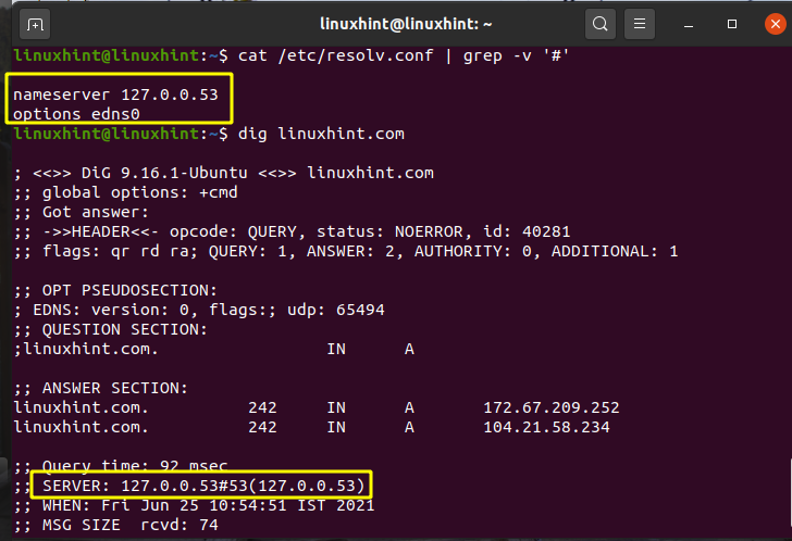 Step 6: Verify the new DNS settings using the dig command as shown below: The content of “/etc/resolv.conf” should not change after any system reboot or after running “dhclient” command.