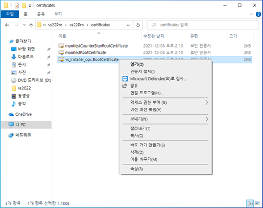 2. 압축이 해제되면 vs22pro 폴더에 certificates 폴더로 들어갑니다.