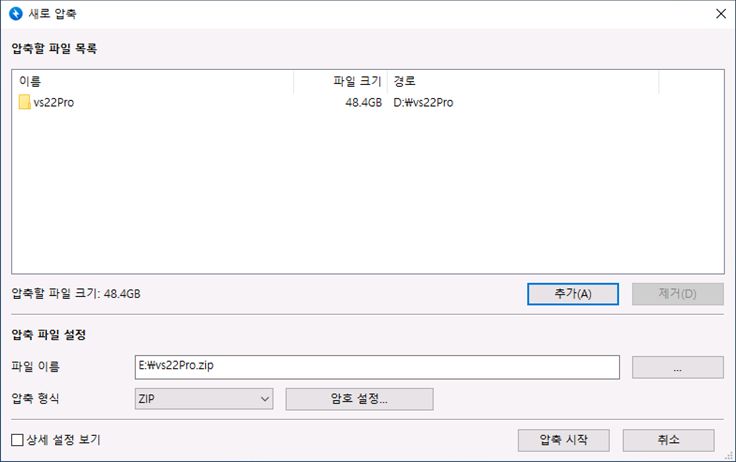 압축 프로그램을 실행하여 vs22Pro 폴더를 "vs22Pro.zip"로 압축합니다.