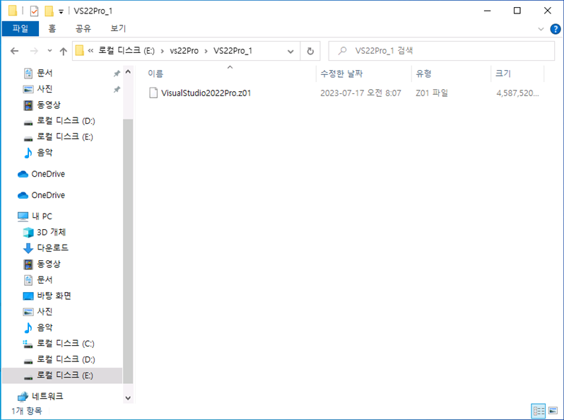 VS22Pro_1 폴더에 VisualStudio2022Pro.z01 파일을 옮겨 놓습니다.