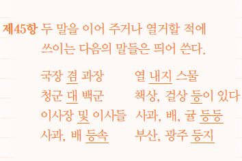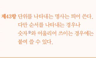 다만 ‘순서를 나타내는 경우’나 ‘아라비아 숫자와 어울리어 쓰이는 경우’에는 아래와 같이 앞말과 띄어 쓰지 않고 앞말과 붙여 쓰는 것도 가능합니다.