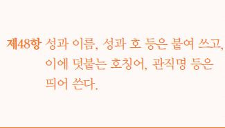 다만 성과 이름, 성과 호를 분명히 구분할 필요가 있는 경우에는 ‘남궁 억’, ‘황보 지봉’과 같이 띄어 쓸 수 있습니다.
