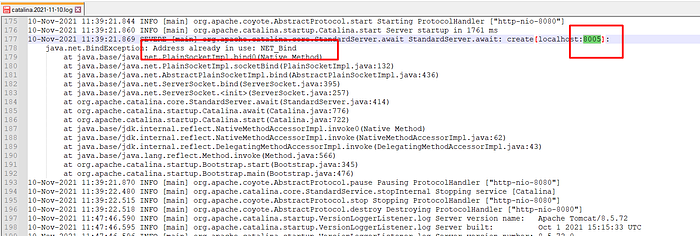 10-Nov-2021 11:39:21.869 SEVERE [main] org.apache.catalina.core.StandardServer.await StandardServer.await: create[localhost:8005]: