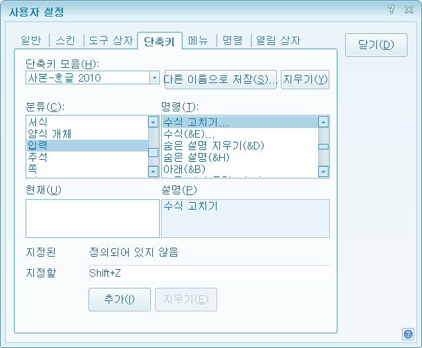 (2)지정할 단축키 칸에 커서를 놓고 원하는 단축키 조합을 누르면 지정할 칸에 자동적으로 단축키 조합이 뜬다. 다행히 Shift+Z 조합은 어디에도 지정되어 있지 않기 때문에 [수식 고치기] 단축키로 지정할 수 있다.