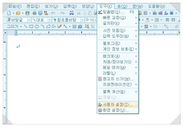 1. [도구]에서 [사용자 설정]을 선택한다.