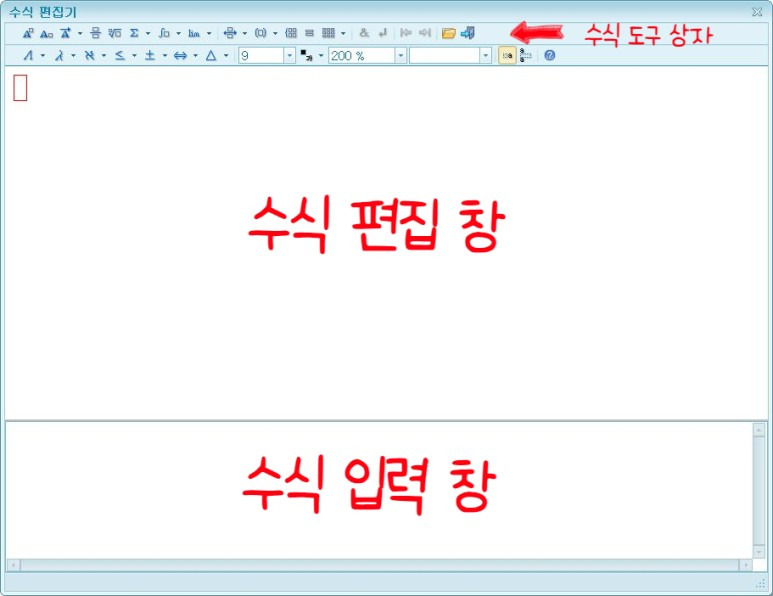 2. 수식 편집기는 [수식 도구 상자], [수식 편집 창], [스크립트 입력 창]으로 이루어져 있다.