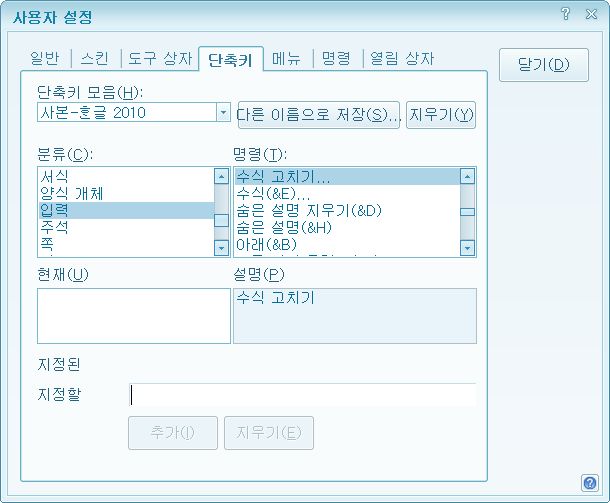 <한글>에서 단축키 수정하거나 새로 지정하기