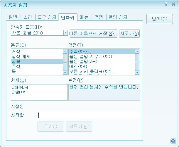 기본적으로 수식 편집기 단축키는 Ctrl+N,M으로 지정되어 있다. 대부분의 단축키 조합은 이미 다른 메뉴들에 지정되어 있을 가능성이 높기 때문에 원하는 단축키 조합을 만들기 어려울 수 있는데, 다행히 Shift+A 조합은 어디에도 지정되어 있지 않기 때문에 [수식 편집기] 단축키로 지정할 수 있다.