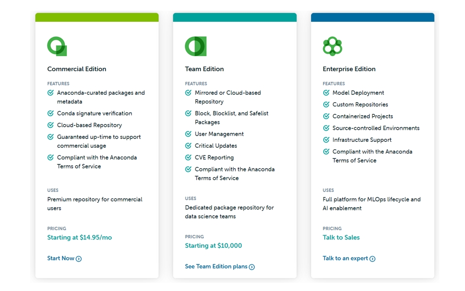 유료버전을 사용하기 곤란한 상황이라면 대안이 있다. 바로 Miniconda를 사용하는 것이다. Minicona는 Anaconda의 minimal 버전으로 무료이다. 파이썬과 패키지 관리자 프로그램이 기본 제공된다. 다만 데이터 분석에 사용되는 패키지들은 포함되어 있지 않으므로 직접 설치해야한다. 회사에서 무료버전을 사용해야하거나 Anaconda에서 제공되는 라이브러리 전체를 사용하지 않아서 가벼운 환경을 원한다면 Miniconda가 대안이 될 수 있다.