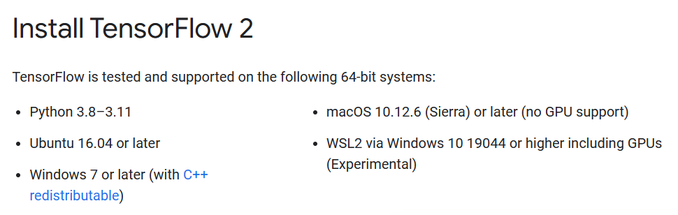 텐서플로우 경우를 예로 들 수 있을 것이다. 텐서플로우는 딥러닝 분야의 기초 라이브러리인데, 위 스샷에 보이는 것과 같이 파이썬 버전에 따라 호환성이 결정된다. 현재 내게 필요한 것은 아니지만 요즘 같은 대 AI 시대에 혹시 모를 상황을 대비하여 해당 호환 버전 내에서 파이썬 버전을 선택하기로 했다.