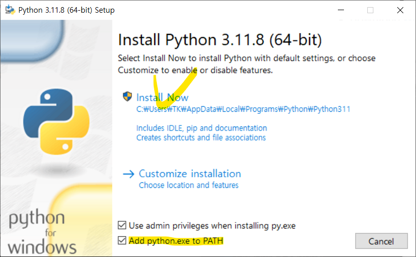 인스톨러를 실행하면 위와 같은 창이 뜨는데, [Add python.exe to PATH] 옵션을 선택해 주고, [Install Now]를 선택하여 설치를 진행하면 된다.