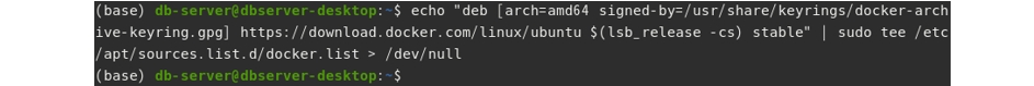 $ echo "deb [arch=amd64 signed-by=/usr/share/keyrings/docker-archive-keyring.gpg] https://download.docker.com/linux/ubuntu $(lsb_release -cs) stable" | sudo tee /etc/apt/sources.list.d/docker.list > /dev/null
