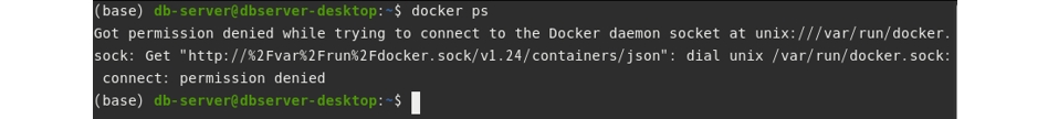 컨테이너 리스트가 출력되지 않고 permission denied 메시지가 출력된다. 도커는 기본적으로 root 권한으로만 명령어 사용이 가능하다.