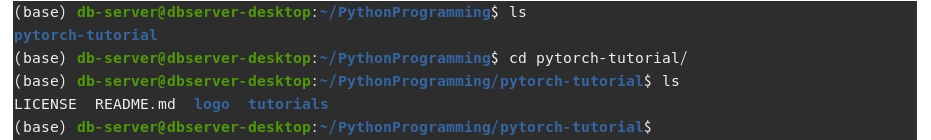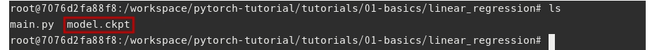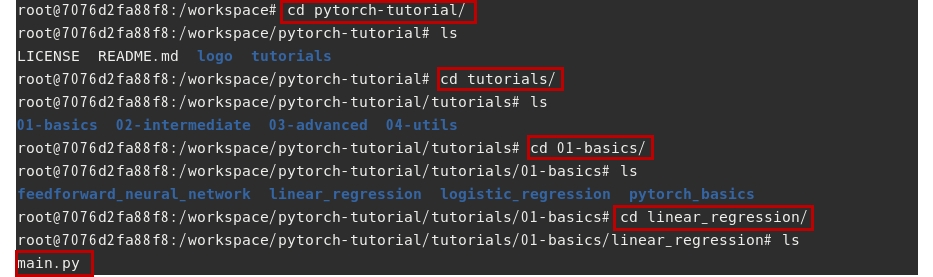 그리고 컨테이너의 쉘의 루트 디렉토리(/workspace) 파일 리스트를 확인해본다. 외부의 PythonProgramming 디렉토리 내부에 있는 pythorch-tutorial 폴더가 확인된다.