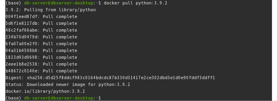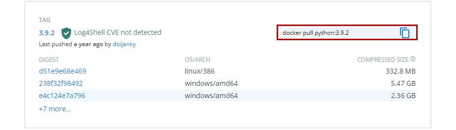 예를 들어 python:3.9.2 이미지를 로컬 PC로 다운로드하기 위해서 다음과 같이 입력한다.
