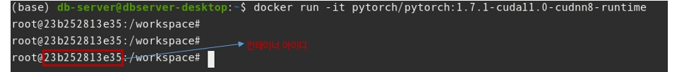 이제 CUDA 런타임이 동작하는 파이토치 컨테이너를 실행한다. 이때 외부의 /PythonProgramming 폴더와 내부의 /workspace 폴더 볼륨을 지정해준다.(앞에서 파이토치 컨테이너의 루트 디렉토리가 /workspace 였음을 기억하자.)