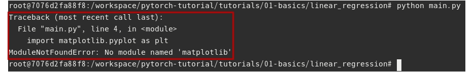 정상작으로 실행되지 않는다. 해당 컨테이너에는 python과 파이토치 라이브러리는 설치되어 있지만, main.py 실행에 필요한 matplotlib 라이브러리가 설치되어 있지 않기 때문이다.