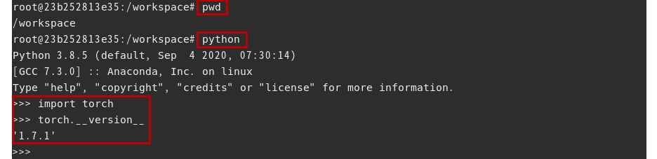 pwd 명령으로 현재 디렉토리를 확인할 수 있다. 본 컨테이너에는 python이 기본으로 내장되어 있다. python 명령을 입력하여 파이썬 인터프리터를 실행할 수있다. 그리고 파이토치 라이브러리를 import하여 버전을 확인할 수 있다.
